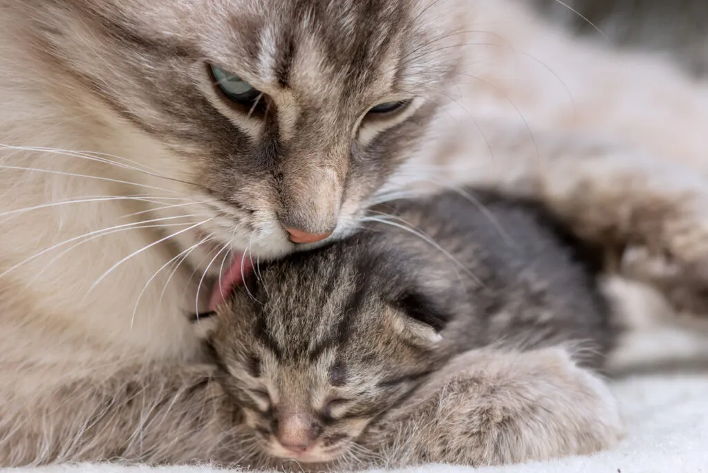 Immediately after the birth, the cat will remove the amniotic sac, bite through the umbilical cord, and clean the kitten. This somewhat rough licking is essential to stimulate the kitten’s breathing.